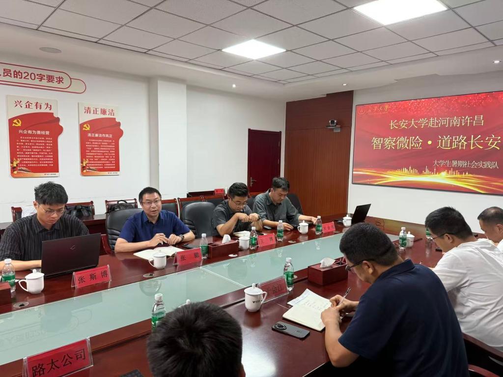 8月8日下午,实践队前往河南越秀尉许(兰尉)高速公路有限公司开展调研交流。长安大学校友、公司总经理于会江等领导出席座谈会,双方围绕高速公路移动作业区碰撞风险预警、主动防控技术等议题展开深入探讨。